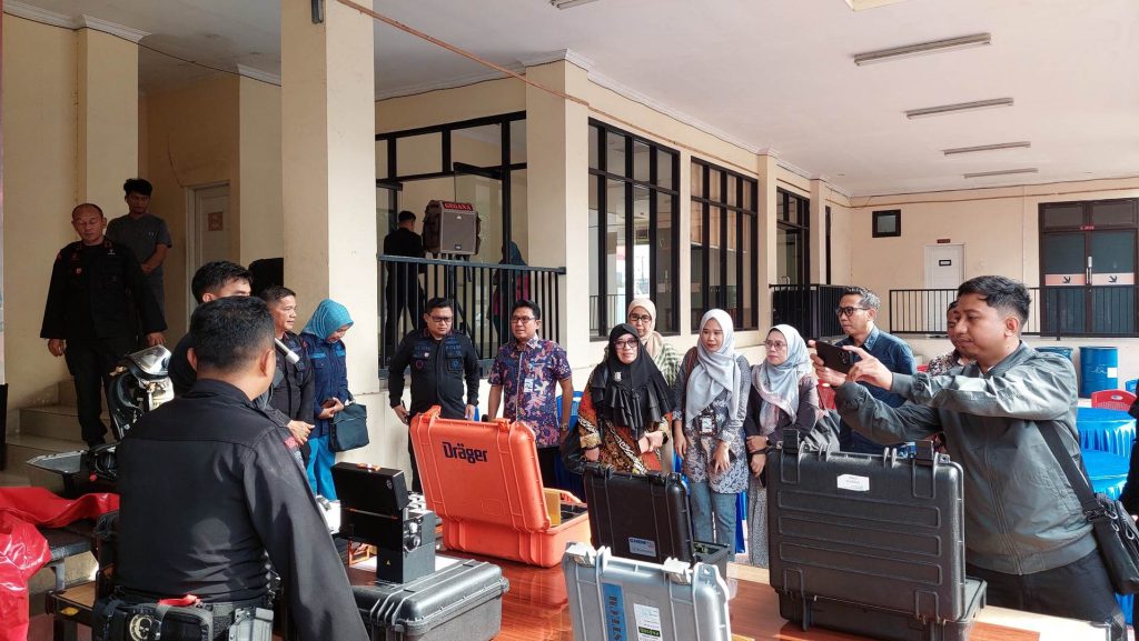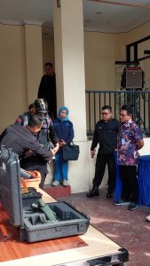 Peserta dari Pusdal LH SUMA-KLH dan Balai Gakkum LH Sulawesi nampak antusias sembari mencatat penjelasan rinci tentang fungsi dan kegunaan deretan peralatan canggih untuk mengindentifikasi ancaman Kimia Biologi Radioaktif dan Nuklir yang ditampilkan dari Anggota Brimob Polda Sulsel.